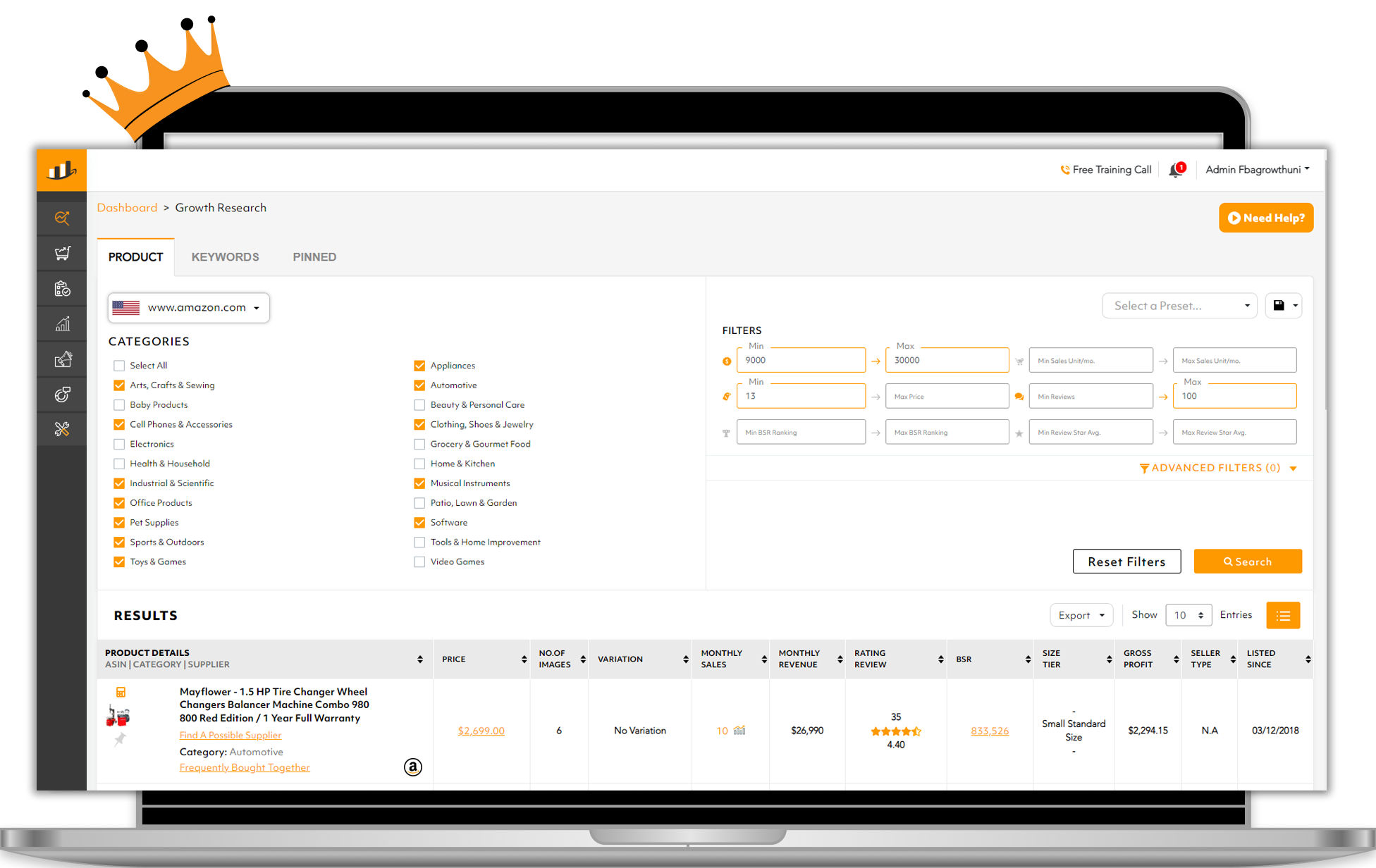 The Growth Research tool helps you identify product opportunities that meet your profitability criteria. Remember the criteria we mentioned earlier? A product with sufficient demand to generate high sales volume, not saturated with many competing sellers, and with good profit margins.